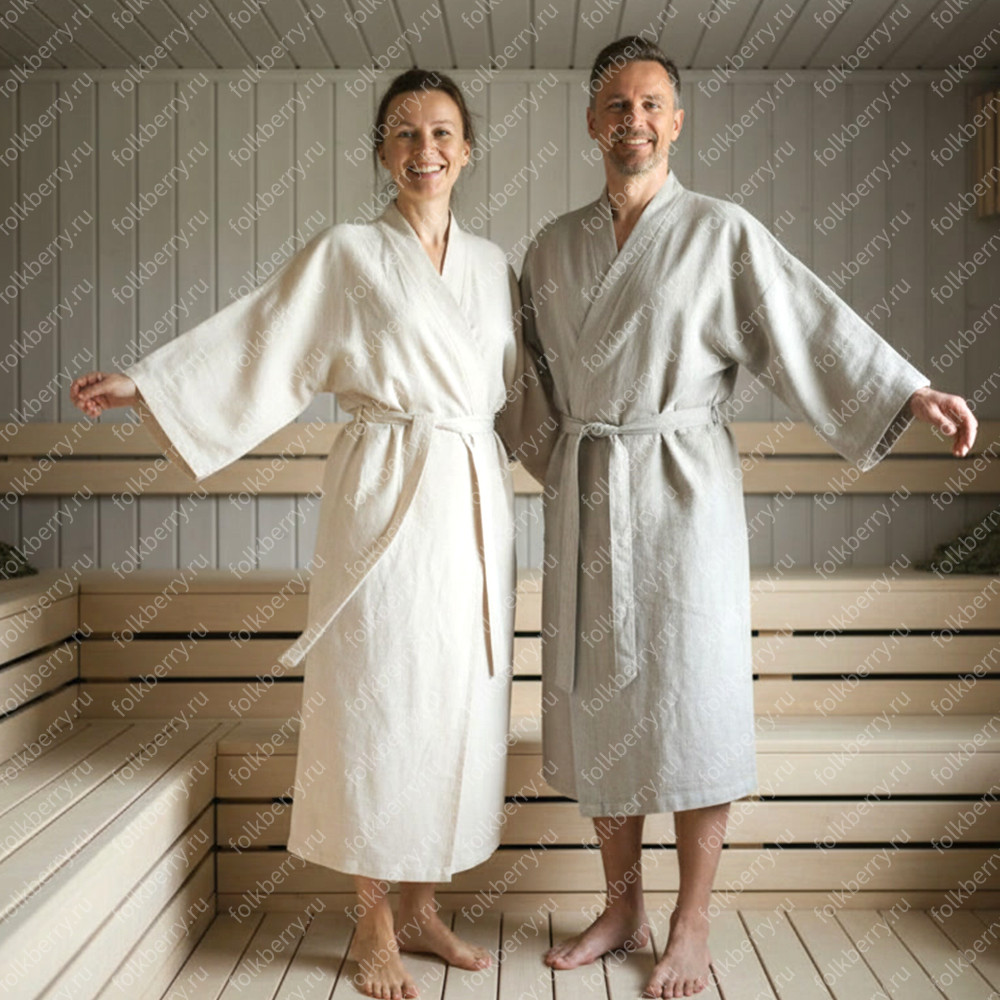 Халат банный предназначена для банщиков, массажистов и любителей бани и сауны. Сшита из мягкого комфортного льна светло-серого цвета,  ткань натуральная, не окрашенная красками, дышащая, не колючая.