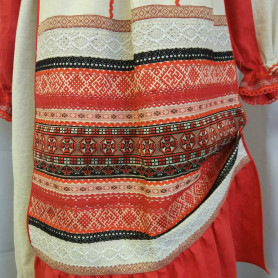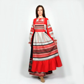 Приталенная модель хорошо сидит по фигуре, расклешенная книзу дает крупные мягкие волны. Сзади расположена застежка «молния». Талия дополнительно подчеркивается поясом. Плечики регулируются по длине. Сарафан украшен широкой полосой из жаккардовой тесьмы, вьюнка, золотистого шнура, кружева.