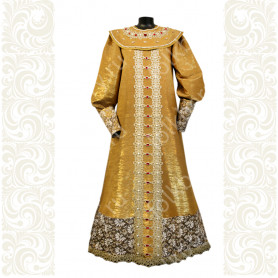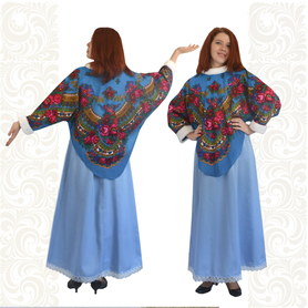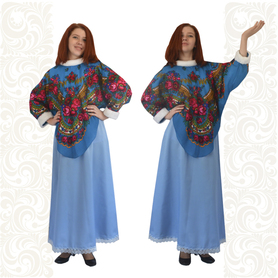 Красивый карнавальный костюм может создать образ Снегурочки, или Снежной королевы, или Зимушки в зависимости от пожеланий его обладательницы. Шубка выполненная из белой парчи с серебристым мерцающим узором (напоминающим ледяные узоры на окнах зимой), украшенная белым искусственным мехом и тесьмой с люрексом. Удобный и универсальный фасон, с регулируемой кулиской по талии, потайной застежкой, расклешеными рукавами.