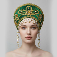 Кокошник выполнен на твёрдой основе, ткань – атлас (креп сатин), декорирован вьюном, тесьмой «завиток»,  а так же бусами, пайетками, и бисером, которые пришиты вручную. Высота изделия составляет над головой 12,5 см, ширина 27 см. Сзади кокошник крепится резинкой и атласной лентой, которая завязывается в бант. Возможно корпоративные сочетания цветов и нанесение Вашего логотипа.