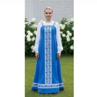 Выполненный в православном стиле сарафан с блузой «Дуняша» сшит из натурального хлопка в цветочек. Модель скромно декорирована однотонным воланом в цвет с основной тканью и тесьмой вьюнок. Можно носить под пояс и регулировать бретели по длине. Белая блузка из хлопка с длинным рукавом расшита натуральным нежным кружевом.