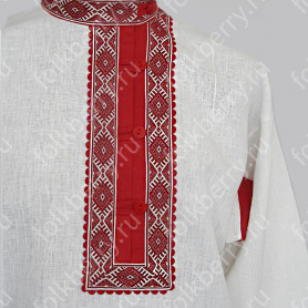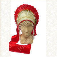 Костюм  выполнен из габардина и красиво подобранного декора в золотистых цветах. Достоинства габардина  в том, что он не мнется, не блестит, как атлас, ложится красивыми  мягкими складками, цвет не выгорает. Юбка  с оборкой, декор в золотистых цветах, по талии на  двойной резинке. Блуза  белого праздничного цвета, с баской,  рукава расширены внизу, с манжетами.   Сзади на блузе шнуровка. Она дает хорошую посадку по фигуре. Костюм предназначен для творческих  сольных и коллективных театральных выступлений.