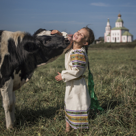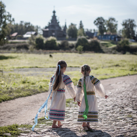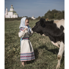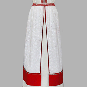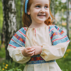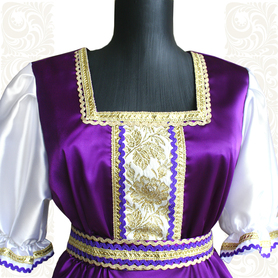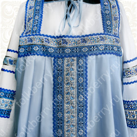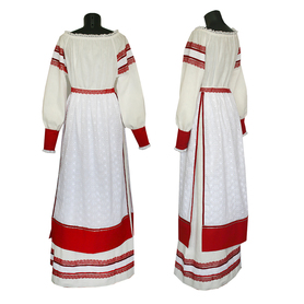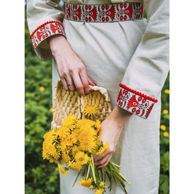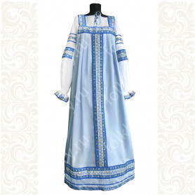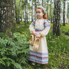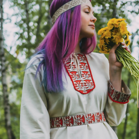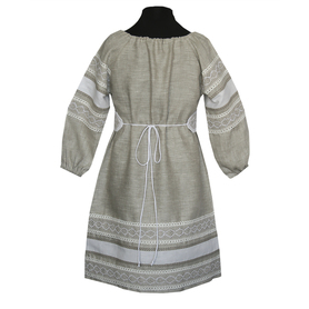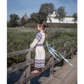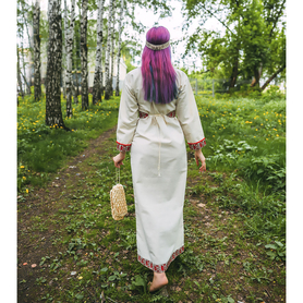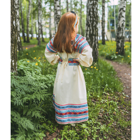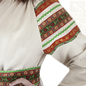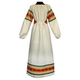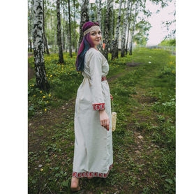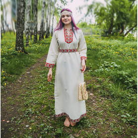 Декор платья - жаккардовая тесьма со славянскими символами. Талия немного завышена, пояс в комплекте.