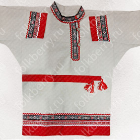Платье сшито из яркого красного атласа и декорировано вставками с рисунком «хохлома». Юбка фасон полтора «солнца», подол и горловина украшены белым кружевом и тесьмой. Рукава «фонарики» сделаны из легкой, белой органзы.
