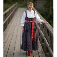 Платье сшито из яркого красного атласа и декорировано вставками с рисунком «хохлома». Юбка фасон полтора «солнца», подол и горловина украшены белым кружевом и тесьмой. Рукава «фонарики» сделаны из легкой, белой органзы.