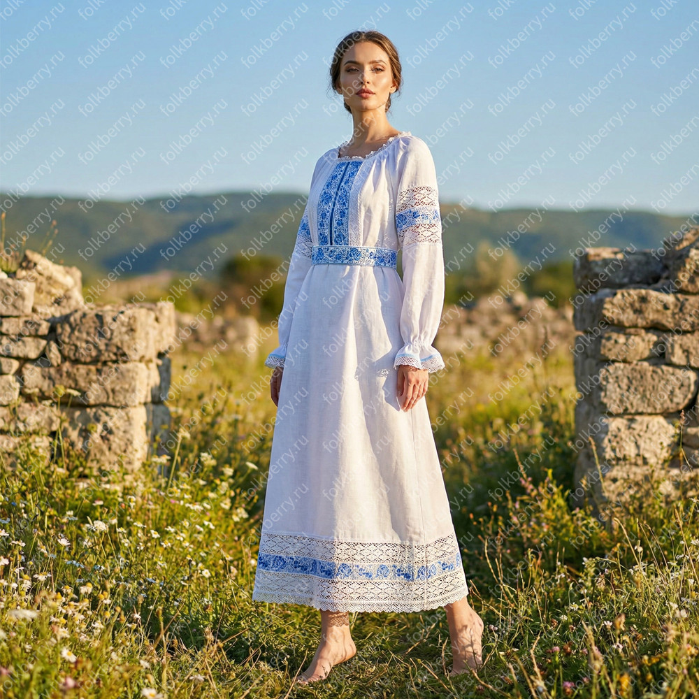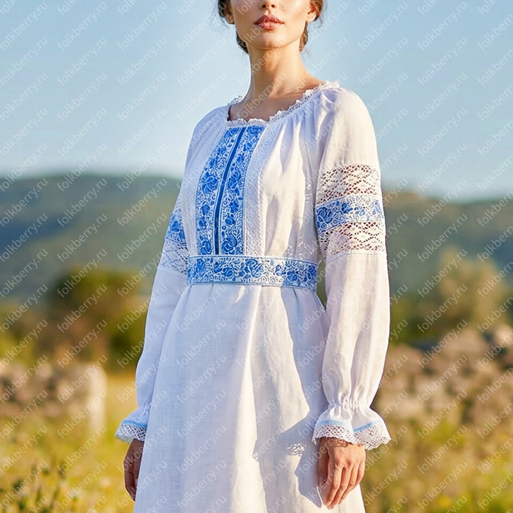 Платье «Кружевная Гжель» -  женственный фольклорный наряд подойдет для особых случаев, например, для венчания или участия в славянских праздниках.