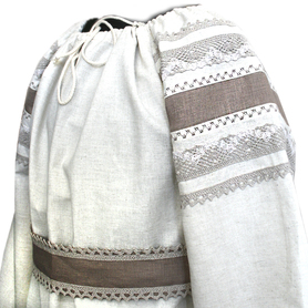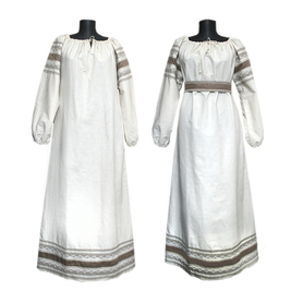 Платье изготовлено из умягченного белого льна и украшено жаккардовой тесьмой с узорами Гжель и  белым кружевом разной ширины, а также бархоткой и  изысканной серебристой тонкой тесьмой. Платье силуэта А, расклешено к низу. В комплект входит  пояс с веревочками на концах. Рукава - удобный реглан, также декорированы кружевом и  жаккардовой тесьмой. Платье немного просвечивает, желательно надевать с легким подъюбником или юбкой-поневой.