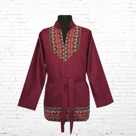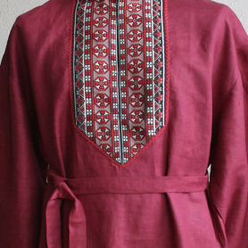 Данная модель привлекает внимание сочным бордовым цветом и благородным, тканным орнаментом на груди. Рубаха «Молодецкая» выполнена из натурального, плотного, умягченного льна. Хороший, оригинальный подарок важному для Вас человеку. В комплекте имеется пояс. По индивидуальному заказу можно подобрать порты.