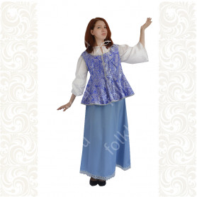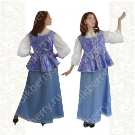 Выполненный в православном стиле сарафан с блузой «Русь» сшит из натурального хлопка в цветочек. Модель скромно декорирована однотонным воланом в цвет с основной тканью и тесьмой вьюнок. Можно носить под пояс и регулировать бретели по длине. Белая блузка из хлопка с длинным рукавом расшита натуральным нежным кружевом.