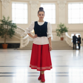 Юбка сшита из ажурного шитья, состоит из трех прямоугольных полотен, соединенных на поясе, украшена красным кружевом, бархоткой в тон, а также блестящей серебристой тесьмой.