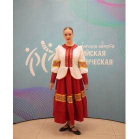 Характерное отличие поневы от любой другой юбки в том, что она обычно изготавливается из трех кусков ткани прямоугольной формы, собранных на общем поясе. Понева выполнена изо льна черного цвета. Каждая часть поневы декорирована жаккардовой тесьмой и вьюнами внизу и по примеру. Примечательно, что широкая тесьма с цветочным узором, выполнена на основе исторического изображения, см. фото. Как правило, поневу надевают на длинную рубаху и подпоясывают тканым славянским поясом или поясом-шнурком.