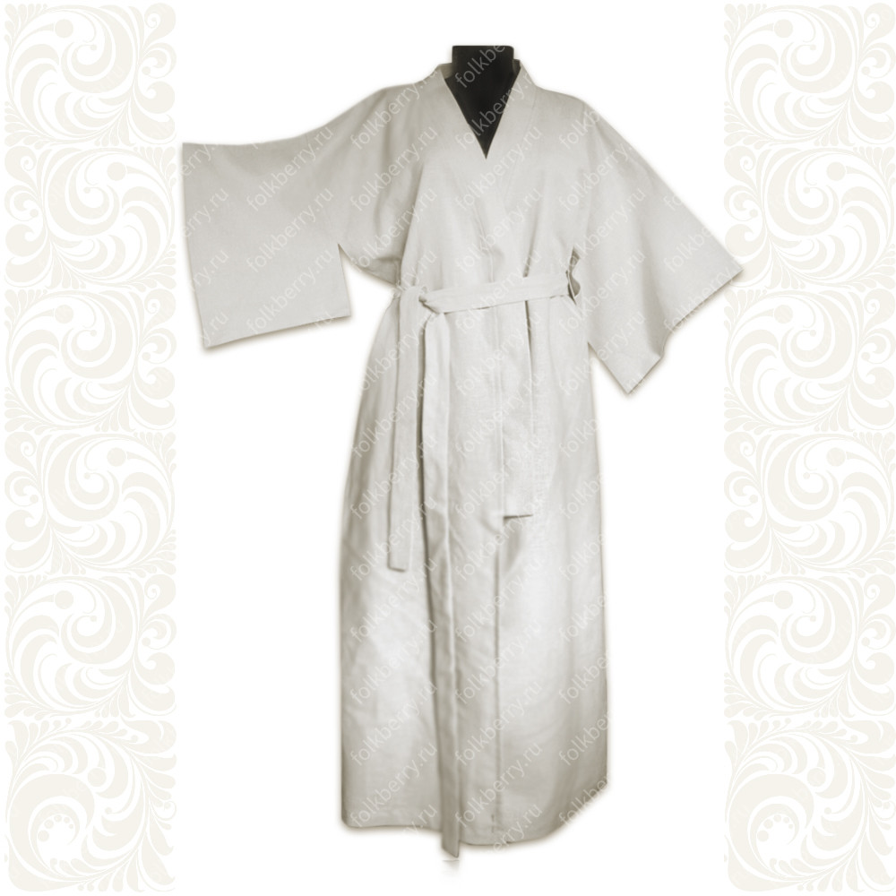 Женский халат-кимоно из натуральной ткани ( 70% лён, 30% хлопок), запашного типа, без вытачек , без пуговиц, без карманов. Пояс в комплекте. Цвет натуральный, небелёный лён.