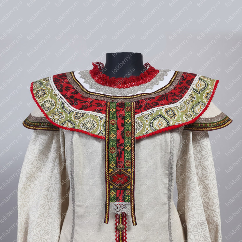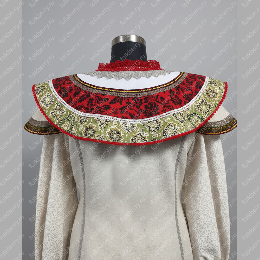 2. Оплечье (съемный круглый плоско лежащий воротник); украшено вологодским кружевом, бусинами, стеклянными стразами рубинового и кремового цвета цвета.