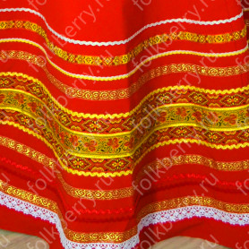 Центральный вертикальный декор платья выполнен из вологодского кружева и стеклянных страз рубинового цвета. Низ платья выполнен из парчи с принтом.